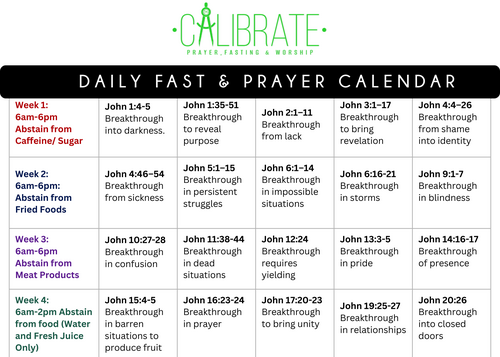 TMGFOC, we are stepping into 20 days of intentional fasting and prayer! Calibrate means to adjust something so that it aligns with its intended purpose. Over these 20 days we’re fasting, praying, and reading through the Gospel of John, watching Jesus' break through barriers and situations that seem impossible. We are positioning ourselves for breakthrough! This is the Year of Breakthrough, and it starts with Alignment!